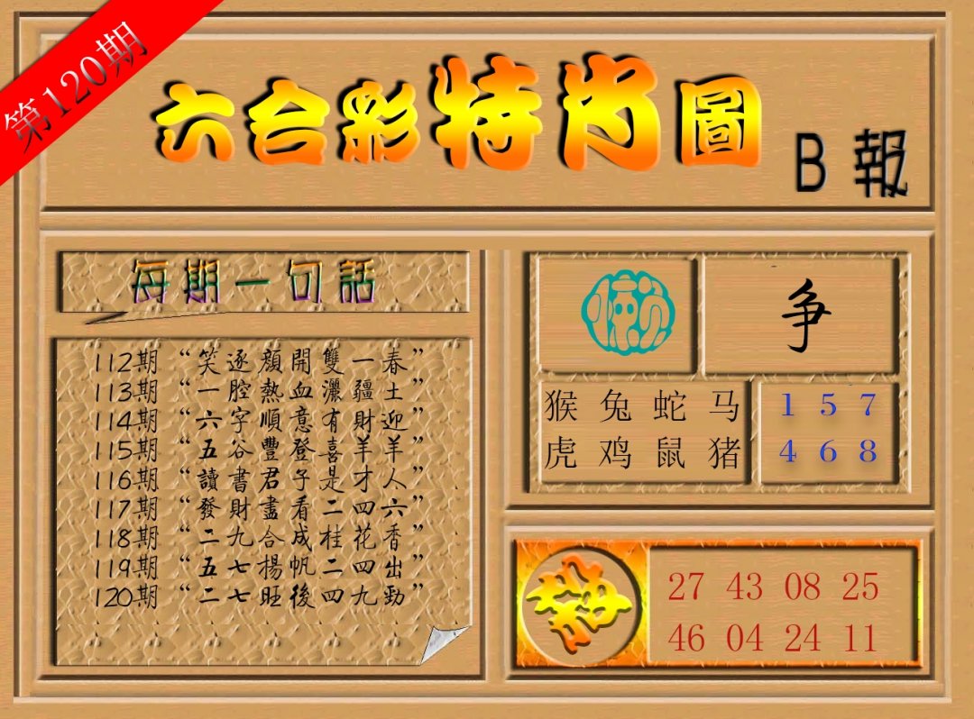 | 120期:复式连肖「蛇马羊猴」开:0000 |